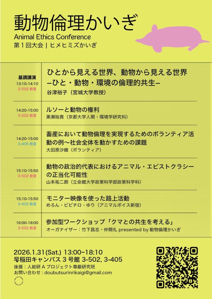 1月31日(土)13:00~、早稲田大学早稲田キャンパス3号館(3-502/3-405)にて、動物倫理かいぎ第1回大会~ヒメヒミズかいぎ~が開催されます。
